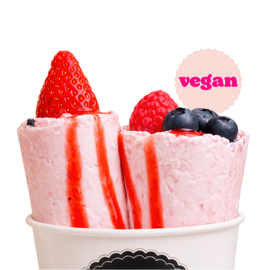 Cremige vegane Eisbasis, gerollt mit Erdbeeren, Blaubeeren & Himbeeren, veredelt mit fruchtiger Himbeersoße.