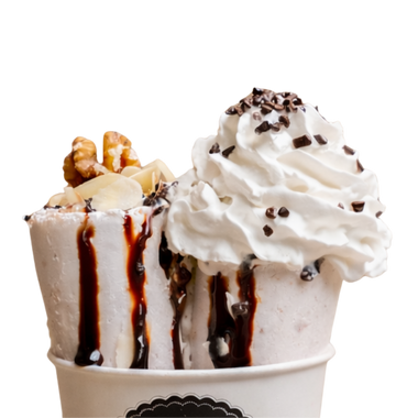 Cremige vegane Eisbasis, gerollt mit Walnuss, Haselnuss & Giotto, verfeinert mit Schokosoße, getoppt mit Schokostreuseln, Mandelsplittern & Sahne.