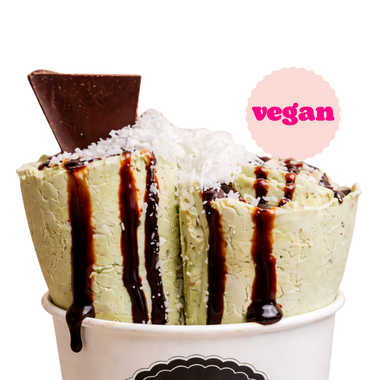 Cremige vegane Eisbasis, gerollt mit Matcha & dunkler Schokolade, getoppt mit Schokosoße und Kokosraspeln.