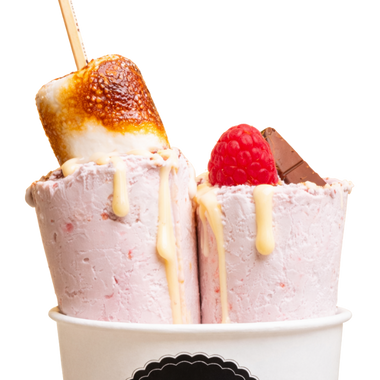 Cremige vegane Eisbasis, gerollt mit Kinder Bueno, frischen Himbeeren & Nutella, getoppt mit Vanillesoße & flambiertem Marshmallow.
